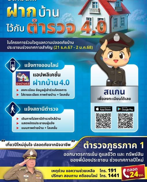 ฝากบ้านกับตำรวจ ในโครงการร่วมใจดูแลความปลอดภัยบ้านประชาชนช่วงเทศกาลสำคัญ (ฝากบ้าน 4.0 ) 25 ธันวาคม 2567 โดย Admin / ข่าวประชาสัมพันธ์ “ตำรวจภูธรภาค 1” ออกมาตรการเข้มดูแลชีวิตและทรัพย์สินของพี่น้องประชาชน ช่วงเทศกาลปีใหม่ รับฝากบ้านกับตำรวจ ในโครงการร่วมใจดูแลความปลอดภัยบ้านประชาชนช่วงเทศกาลสำคัญ (ฝากบ้าน 4.0 ) เริ่ม 21 ธ.ค.67 – 2 ม.ค.68 . เหตุด่วน ขอความช่วยเหลือ โทร. 191 ตลอด 24 ชั่วโมง