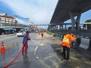 สภ.บางพลีน้อย ร่วมกับเทศบาลตำบลบางพลีน้อย และเจ้าหน้าที่กรมทางหลวงสมุทรปราการ ฉีดน้ำทำความสะอาดดินโคลนตกหล่นบริเวณริมถนนบางนาตราด (ขาเข้า – ขาออก ) พร้อมทั้งจับกุมรถบรรทุกดินที่กระทำความผิด