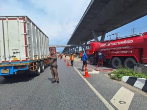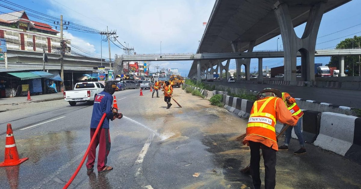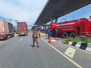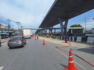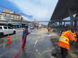 สภ.บางพลีน้อย ร่วมกับเทศบาลตำบลบางพลีน้อย และเจ้าหน้าที่กรมทางหลวงสมุทรปราการ ฉีดน้ำทำความสะอาดดินโคลนตกหล่นบริเวณริมถนนบางนาตราด (ขาเข้า – ขาออก ) พร้อมทั้งจับกุมรถบรรทุกดินที่กระทำความผิด